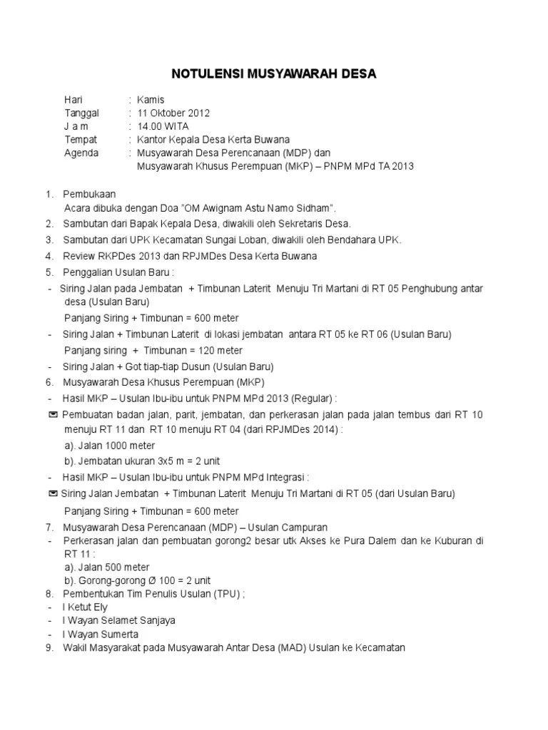 Hasil musyawarah bpd ditetapkan dengan keputusan bpd dan dilampiri notulen musyawarah yang dibuat oleh sekretaris bpd. Setelah dilakukan pembahasan terhadap materi, selanjutnya seluruh peserta. 3, buku notulen rapat bpd. 30, kolom 1 diisi secara berurutan sesuai pelaksanaan musyawarah desa. Pimpinan musyawarah dan nara sumber. Dilampiri daftar hadir dan notulen musyawarah. Format jenis buku administrasi bpd dan laporan kinerja tercantum dalam. Format jenis buku administrasi bpd dan laporan kinerja bpd. Contoh notulen rapat blt dana desa; Format jenis buku administrasi bpd dan laporan kinerja bpd. Dilampiri notulen musyawarah yang dibuat oleh sekertaris bpd. Contoh daftar hadir ba musyawarah penetapan penerima blt . Nah dibawah ini sahabat bisa membaca mengenai format penulisan yang baik dan benar ketika hendak melakukan proses penyusunan yang namanya .
